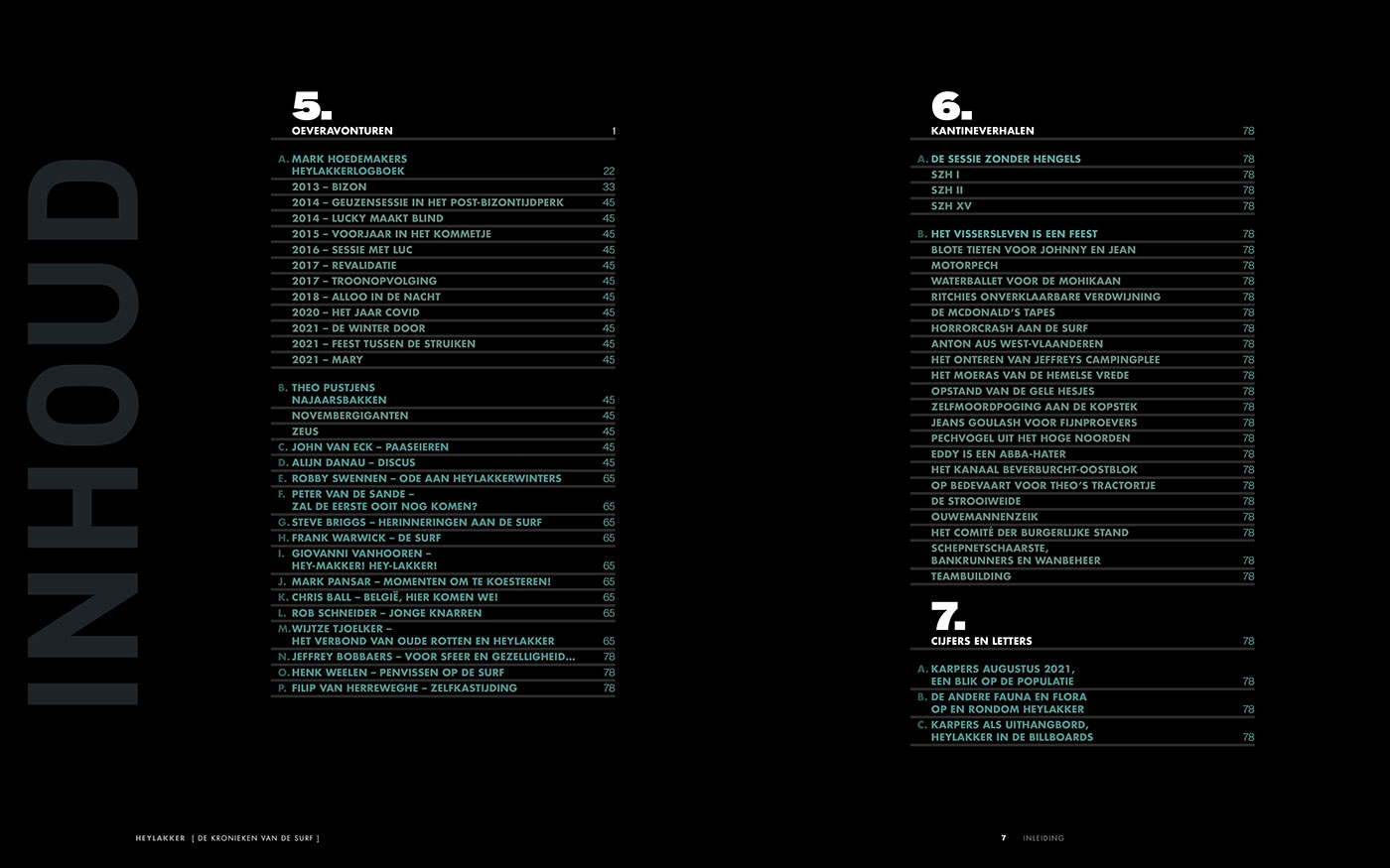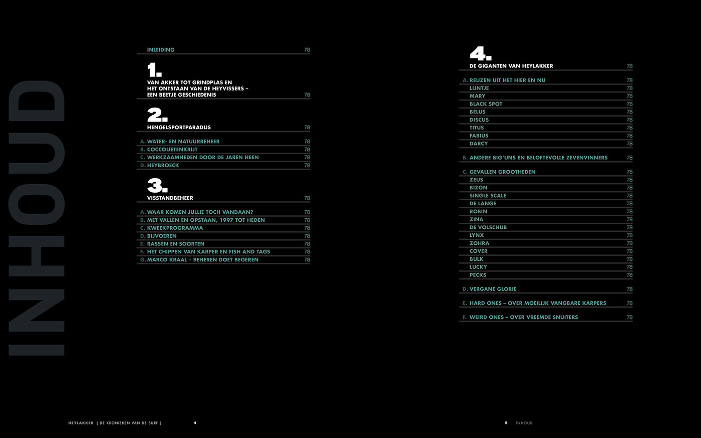 In het boek wordt ruim uitgeweid over de geschiedenis van de plas, de illustere club Heyvissers en heel wat bijzondere karpers die er ooit zwommen en vandaag de dag nog zwemmen. Verder lees je tal van visverhalen (niet alleen Theo’s en Marks belevenissen, maar ook die van een hele trits gastschrijvers), en wordt er in het luik ‘kantineverhalen’ meer dan een tipje van de sluier opgelicht over vreemde, gekke of aangebrande fratsen, die meestal plaatsvinden in de buurt van het clubhuis. Vanzelfsprekend krijgen ook de thema’s water- en visstandbeheer een prominente plek in het naslagwerk.